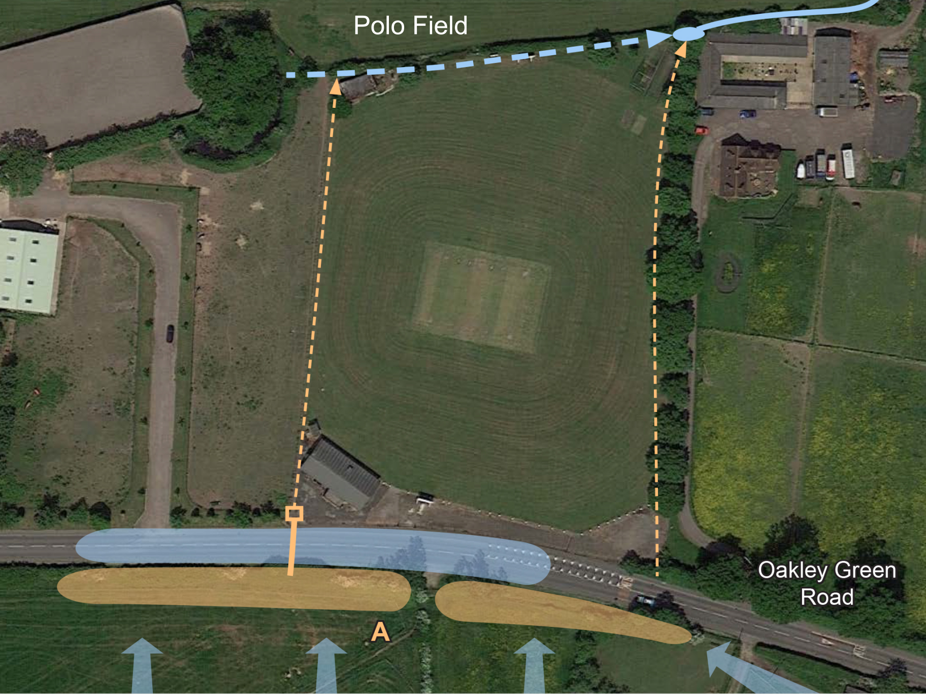 We asked Streetcare to investigate further as the Cricket Club were reporting increasing problems also. They confirmed in 2014 that the culverts crossing Oakley Green Road in the vicinity of the cricket club had again been checked and cleaned. A site meeting took place on Tuesday July 15 2014. The pitch and nets get flooded in the winter and the Oakley Green Road frequently floods along their stretch. We believe the root cause of the road flooding is an inadequate capacity in culvert and chamber at their south west corner and the underground pipe heading north from there along their western boundary. Until such time as the capacity of this route is increased we do not expect to see any improvement. We need to investigate with landowners the possibility of introducing a sump or pond area to try and hold back excess water at times of heavy rainfall. We understand that Streetcare were, and now Project Centre are, considering our earlier suggestions of delaying the arrival of water flowing towards this point and increasing the holding capacity of the ditch and ground on the southern side of the road at (A). We still await their proposals with interest. Although happening far less frequently than in the past this site has again been briefly flooded in winter 2020 and consequently this wet spot has been returned to RED status. | ||||