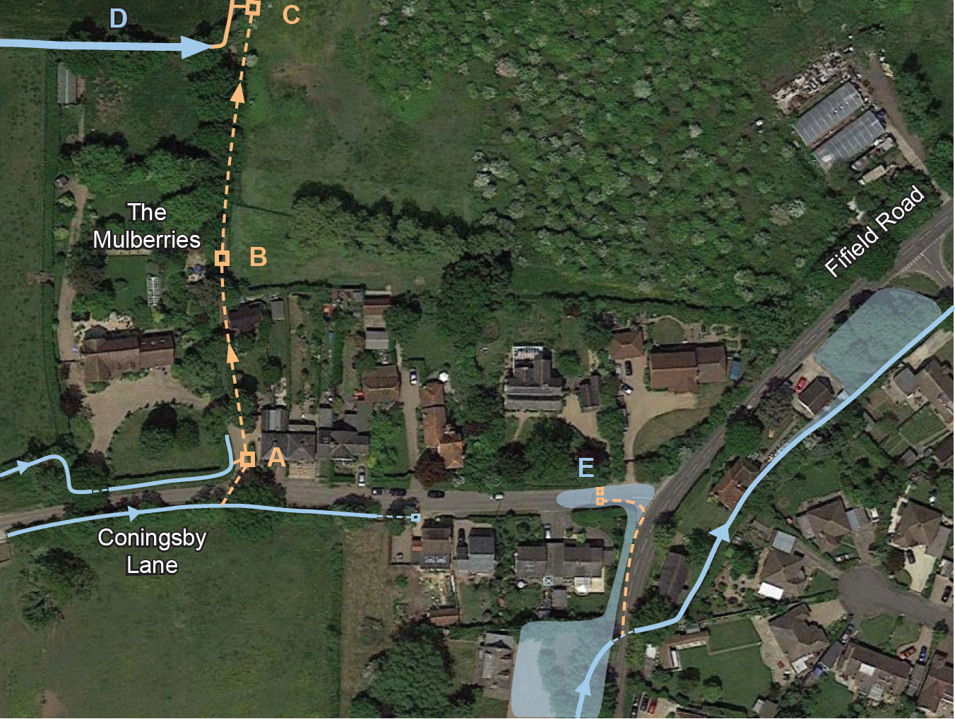 During the summer of 2019 RBWM Project Centre contractors finally carried out the project that has been proposed since 2001. In those early days the issue was just to re-instate the ditch that used to run along the west side of the access track (A-C). During the following years the ditch became filled in and overgrown so it became less problematic to install a large bore pipe instead. A new culvert under the lane now takes water from the southern ditch to a chamber (A) on the north side. A new pipe from the ditch in front of the Mulberries also feeds into this chamber. From there a new pipe runs north to a chamber (B) and onward to a third chamber (C) from where a new pipe exits into the ditch. This ditch has been enlarged and regraded northward to a new pipe and chamber under the footpath and then all the way around the edge of the Biffa land to exit onto Fifield Road. This new route has been carrying a huge volume of water northwards away from Coningsby Lane and no longer has to try to exit southwards onto Willow Creek land to try and find its way to the Fifield Road culvert and then northwards on the east side of Fifield Road. The large amount of water that has in the past collected along the northern boundary of the Mullberries (D) and saturated the rear land of the property is now finally also able to escape as always intended. In extreme conditions there is still a collection of water (E) at the junction with Fifield Road. This is short-lived and is no longer caused by the large amount of water unable to escape, overflowing the ditches, and pouring down the road. Some of this seems to be coming from a backup from the Fifield Road culvert and it is possible that some is backing up from the same culvert when it is full through the gullies because of silted-up one way valves. These are different problems that must now be considered in their own right. | ||||