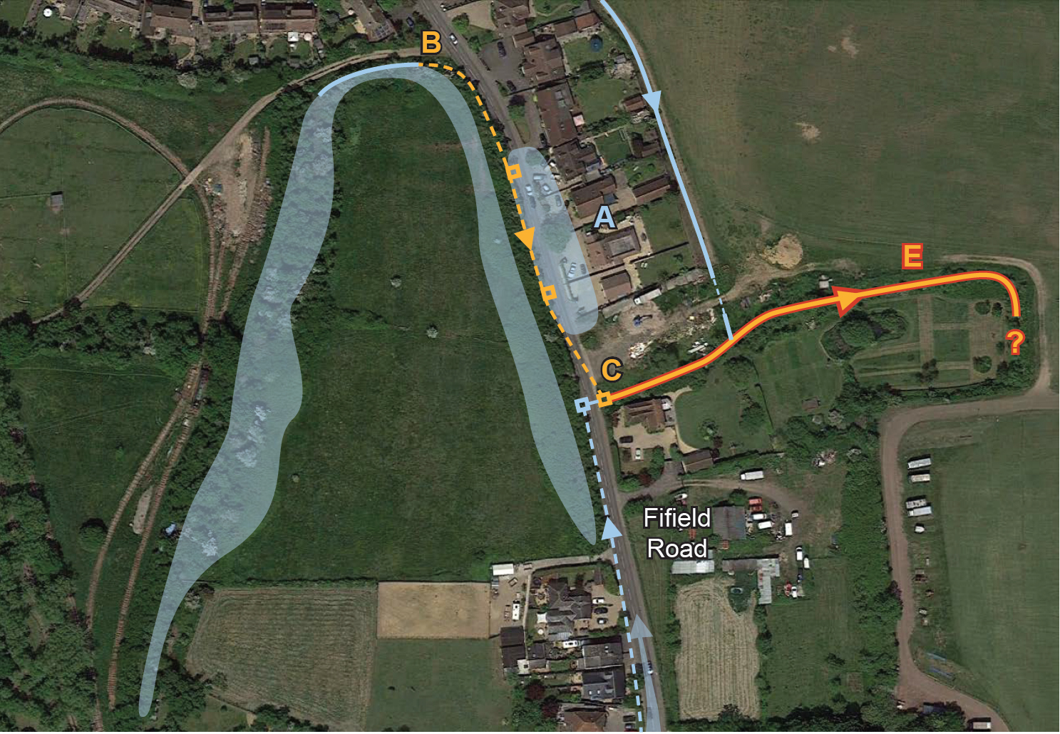 Streetcare’s investigations led them to a decision to pipe the whole length from (B) to the chamber at (C) and renew roadside gullies and curbs. However, they said that the outflow from the chamber (C) flowing eastward beside the boundary of Garden Cottage along ditch (E) towards the Polo pitch needed to be cleaned out or the system would still back up. We wrote to the Landowner and a site meeting took place on Thursday July 17 2014. The landowner, Mr Bennett, met with us and Streetcare on site and agreed to clear the ditch. At the end of October 2014 Streetcare carried out work and the new gullies now feed into this new pipe and from there under the road to the chamber. The contractors reported that the ditch towards the polo pitch still needed to be cleaned out or water would back up in the new pipe. Streetcare contacted the landowner again who promised to carry out the necessary maintenance. Unfortunately as far as we are aware this work has still not yet been done but this location has a GREEN status until wet weather shows if it is still deficient. | ||||